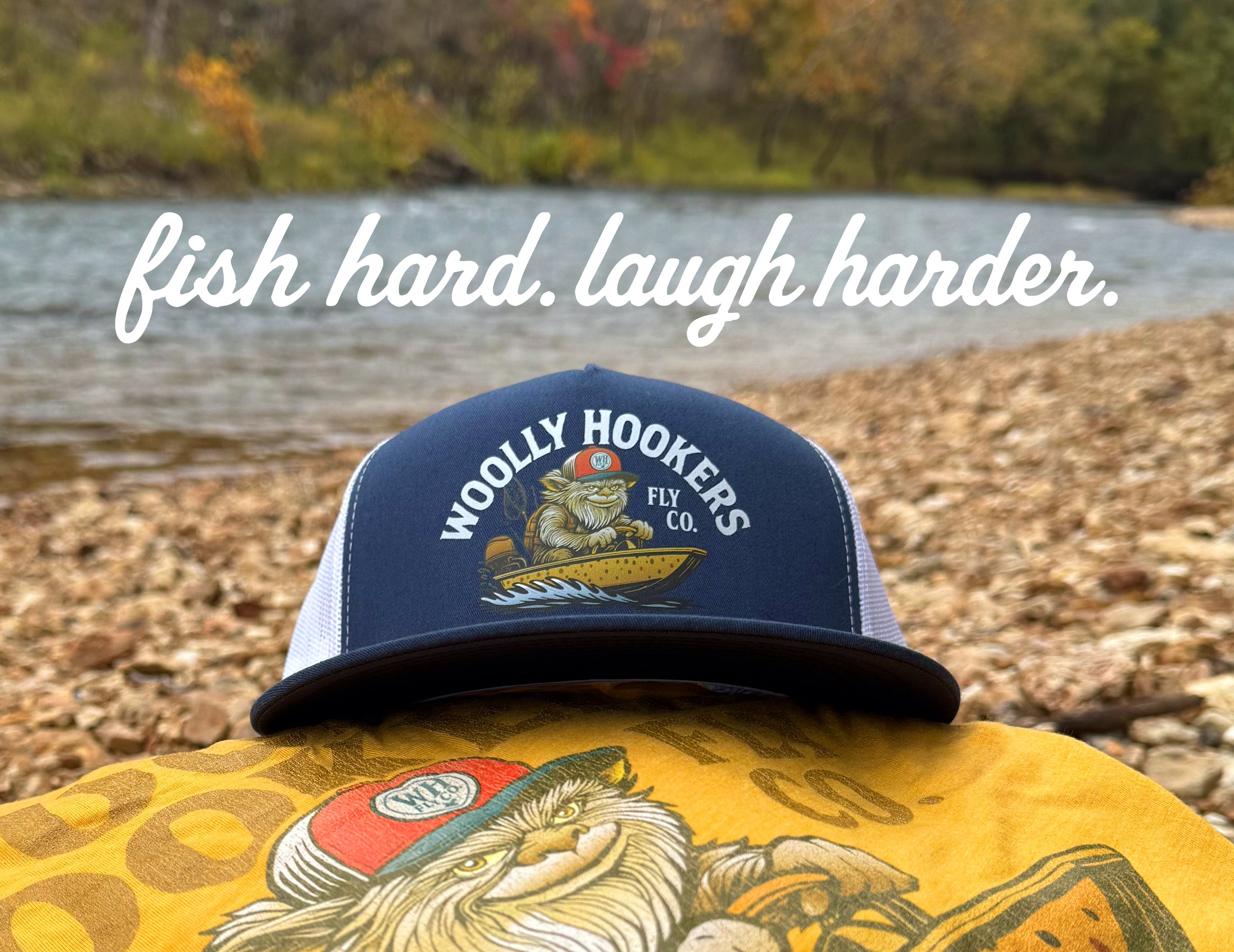 Our mascot Woolbert isn’t a trout—he’s a full-blooded Woolly Hooker. Part legend, part mischief, and 100% the spirit of every angler who’s ever snapped a line, missed a hook-set, and laughed about it anyway. Woolbert’s here to remind you: if you’re not having fun, you’re doing it wrong.